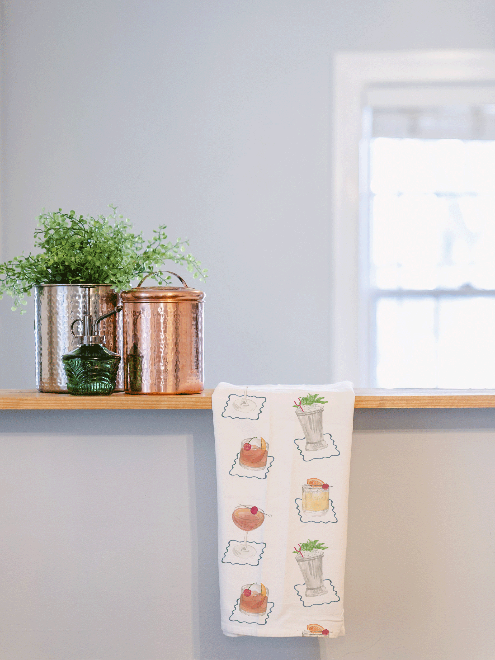 This all-over print tea towel features your favorite Bourbon cocktails on a 27"x 27" 100% tea towel.