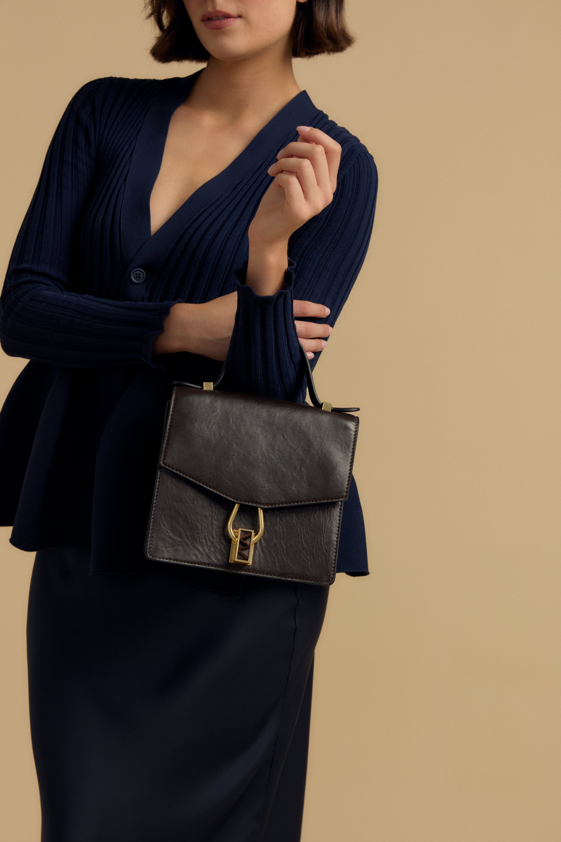 Timeless structure meets nature’s brilliance in the Chelsea Lock Top Handle Bag. Designed with refined lines and finished with a hand-applied panel of copper turkey feathers, this crossbody brings warmth, texture, and understated glamour to any look. The copper feathers shimmer with natural iridescence - revealing rich tones of bronze, chestnut, and burnished gold that shift beautifully with the light. The classic top-handle silhouette, paired with a removable crossbody strap, offers versatile styling from day to evening.