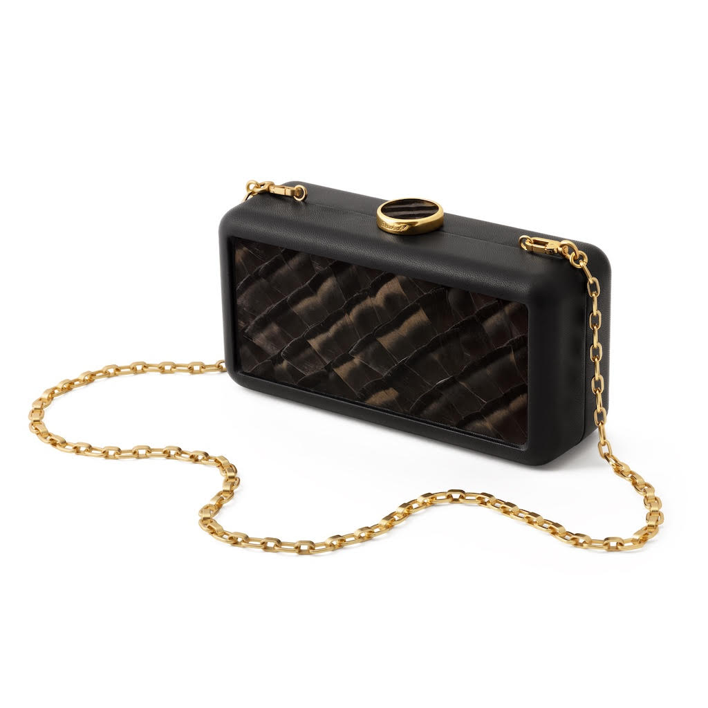 Inspired by understated elegance and quiet luxury, the Le Marais Clutch is a refined companion for both day and evening occasions. This design features a sleek, structured silhouette accented by a hand-laid feather panel of slate-colored turkey feathers, offering natural iridescence and subtle tonal depth. The cool slate palette reflects the soft mystery of twilight skies and polished stone, making it a versatile accessory that pairs effortlessly with both modern minimalism and classic sophistication.