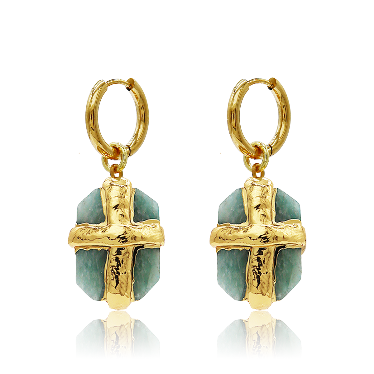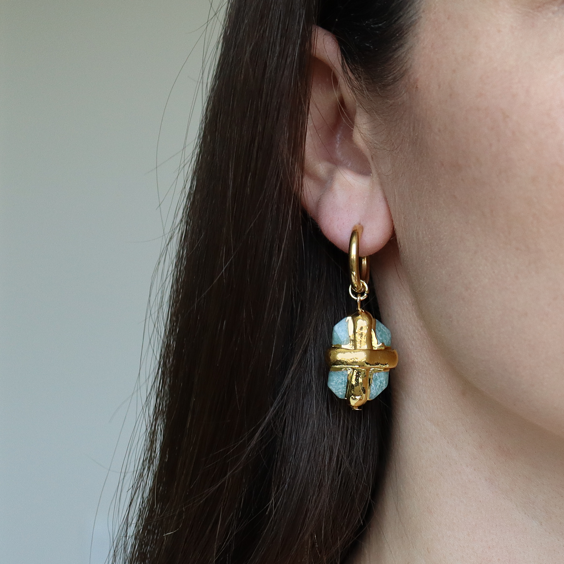 Golden hoops with a bold summer soul. These elegant mini hoops feature and an embellished Amazonite stone that sways gently with every step. The soft sea-glass hue of the stone brings a breezy, sunlit feel- perfect for summer days and golden hour nights. A refined addition to our Summer Collection.