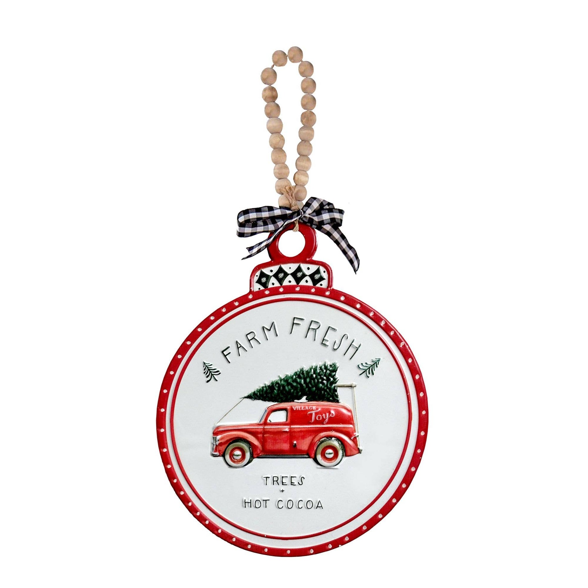 Farm Fresh Village Toys Metal Sign is a vintage-inspired, Christmas bauble sign that features a car hauling a Christmas tree and the phrase, "Farm Fresh - Trees + Hot Cocoa." Sign includes a natural wood beaded hanger that is accented with a fabric bow. Measures 12.75" high by 10.5" wide and .25" deep.