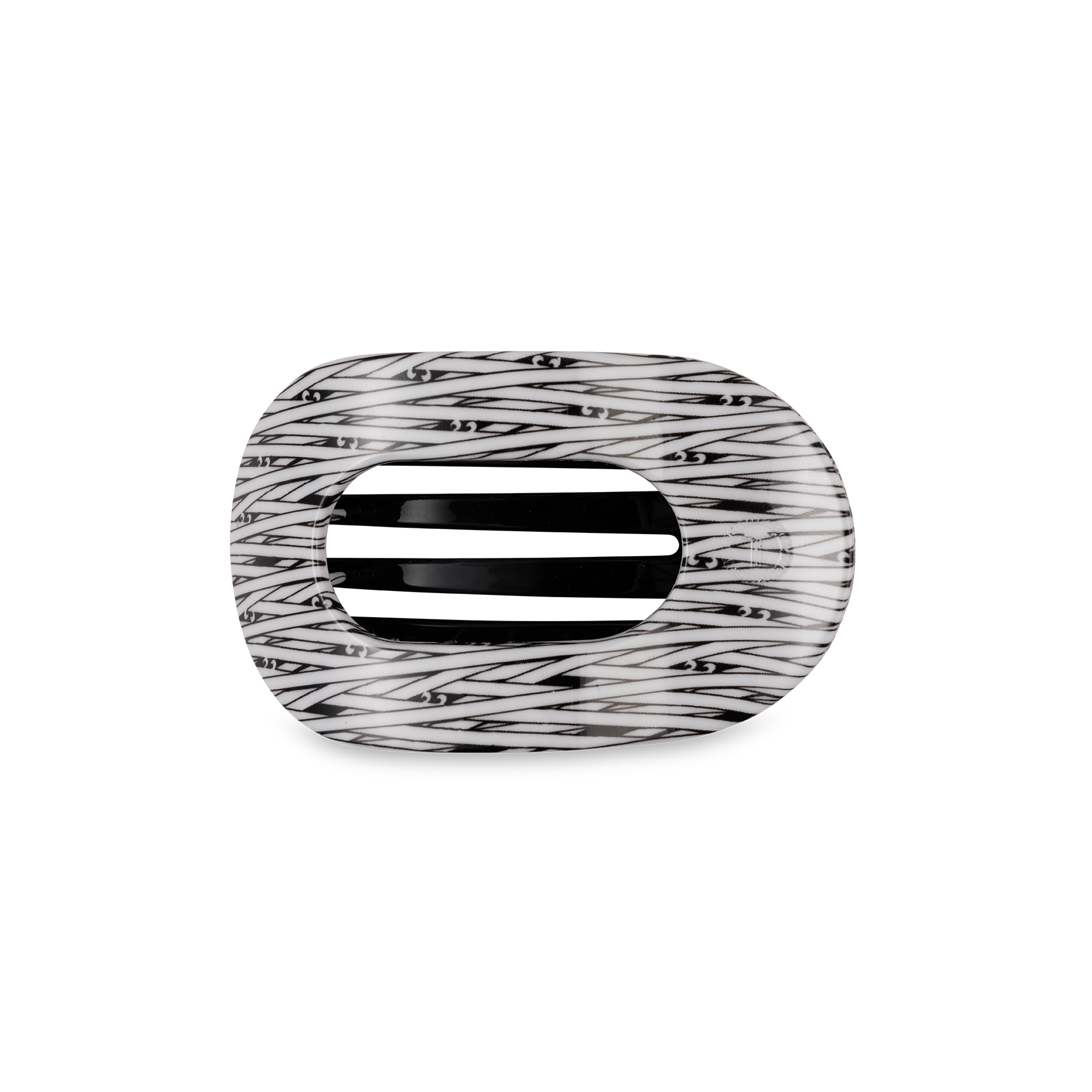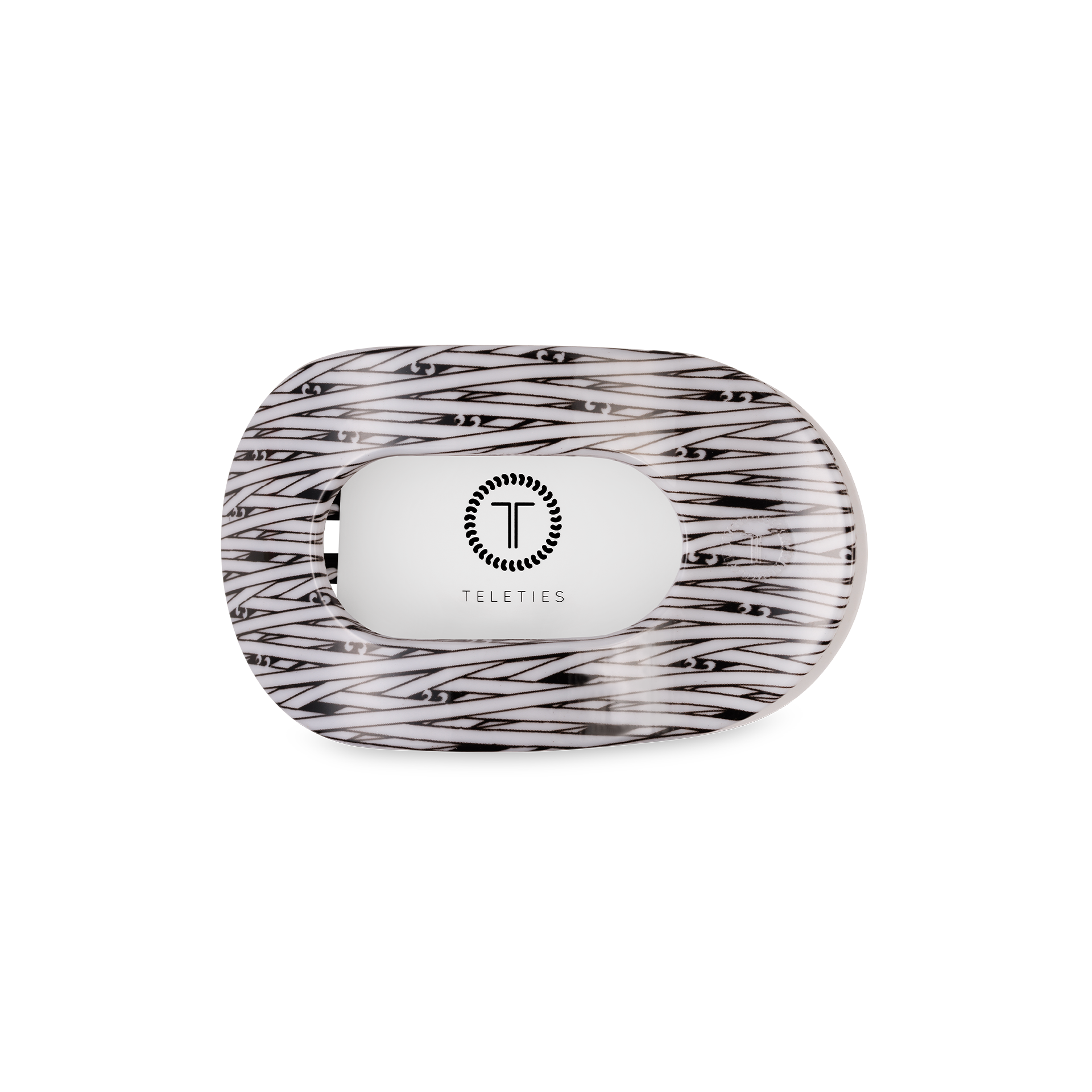 Lay flat and relax with the new TELETIES Mummy Knows Best Small Flat Round Hair Clip in Black and White. This hair clip is designed to allow you to lay back flat, do yoga, or sit comfortably in a seat with a headrest, and it is made with the same material that is nearly unbreakable.