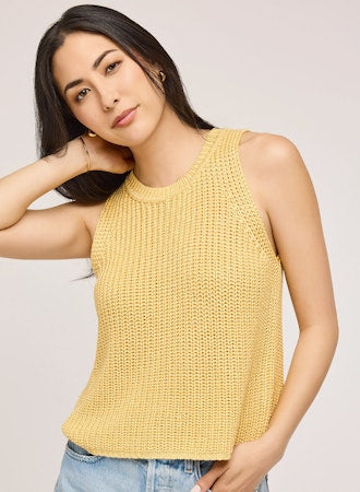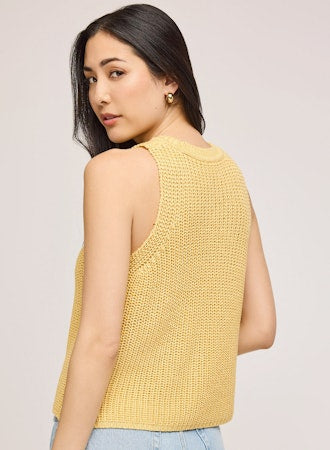 The Andrea tank is done in two colors, sunshine yellow and Matcha green, And made with 100% jumbo acrylic yarn.