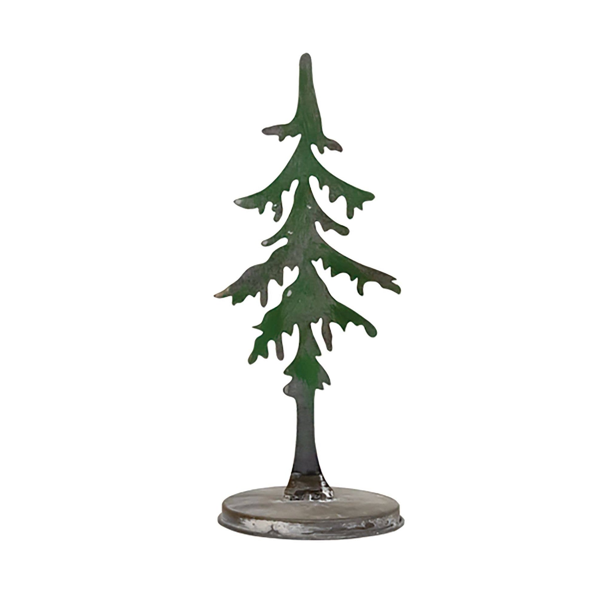 Large Metal Pine Tree is a painted metal accent with distress marks and an unpainted base. Tree has a rustic finish and looks great displayed on a shelf, tabletop, or mantelpiece. It pairs well with resin figurines and festive cut-outs and measures 13" high by 4.5" wide.