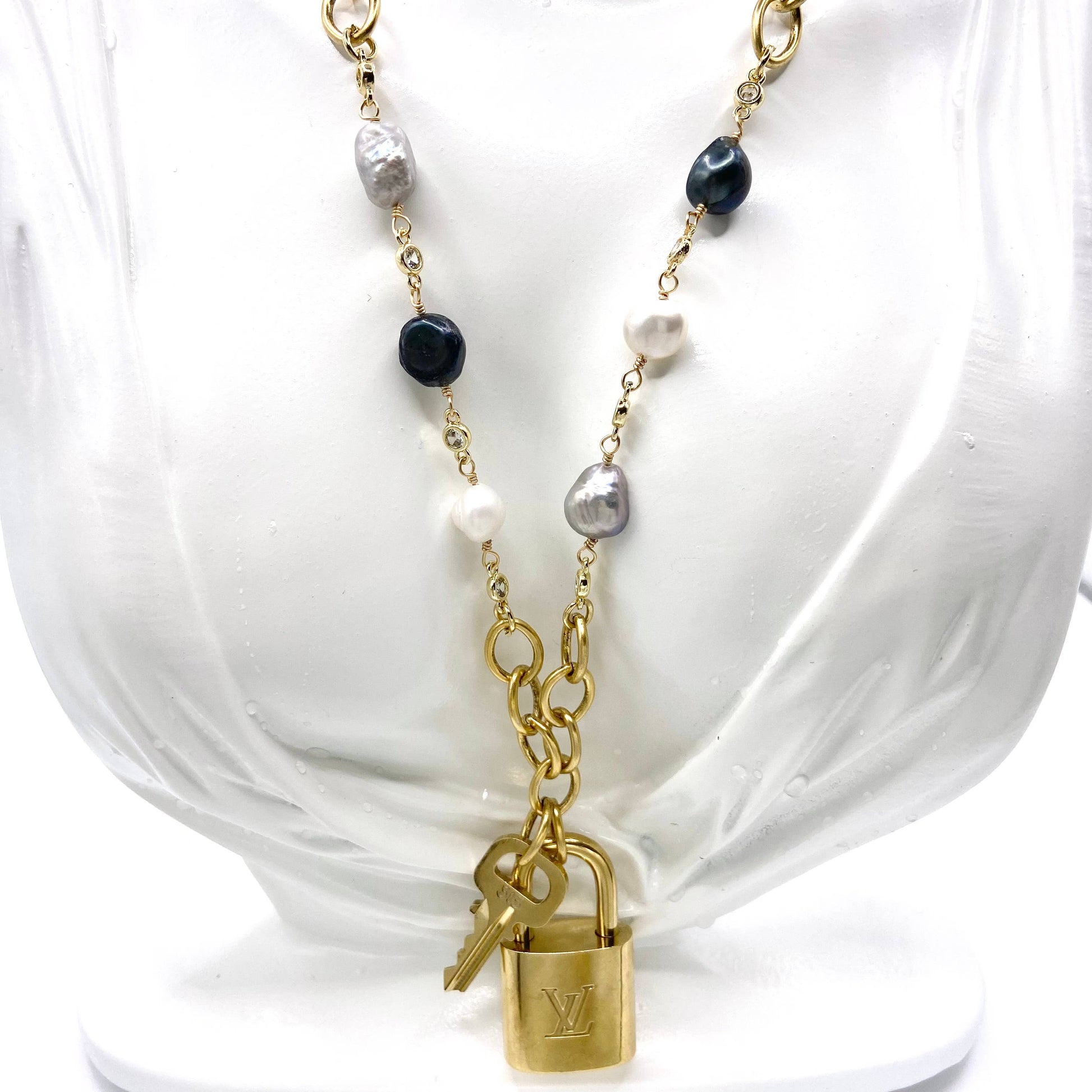 Elevate your look with this one-of-a-kind necklace featuring luminous real freshwater pearls in shades of white, gray, and denim blue paired with sparkling crystal accents. The bold hand casted gold chain is finished with a striking Louis Vuitton padlock and key charm centerpiece – giving this piece a high-fashion edge with timeless sophistication.