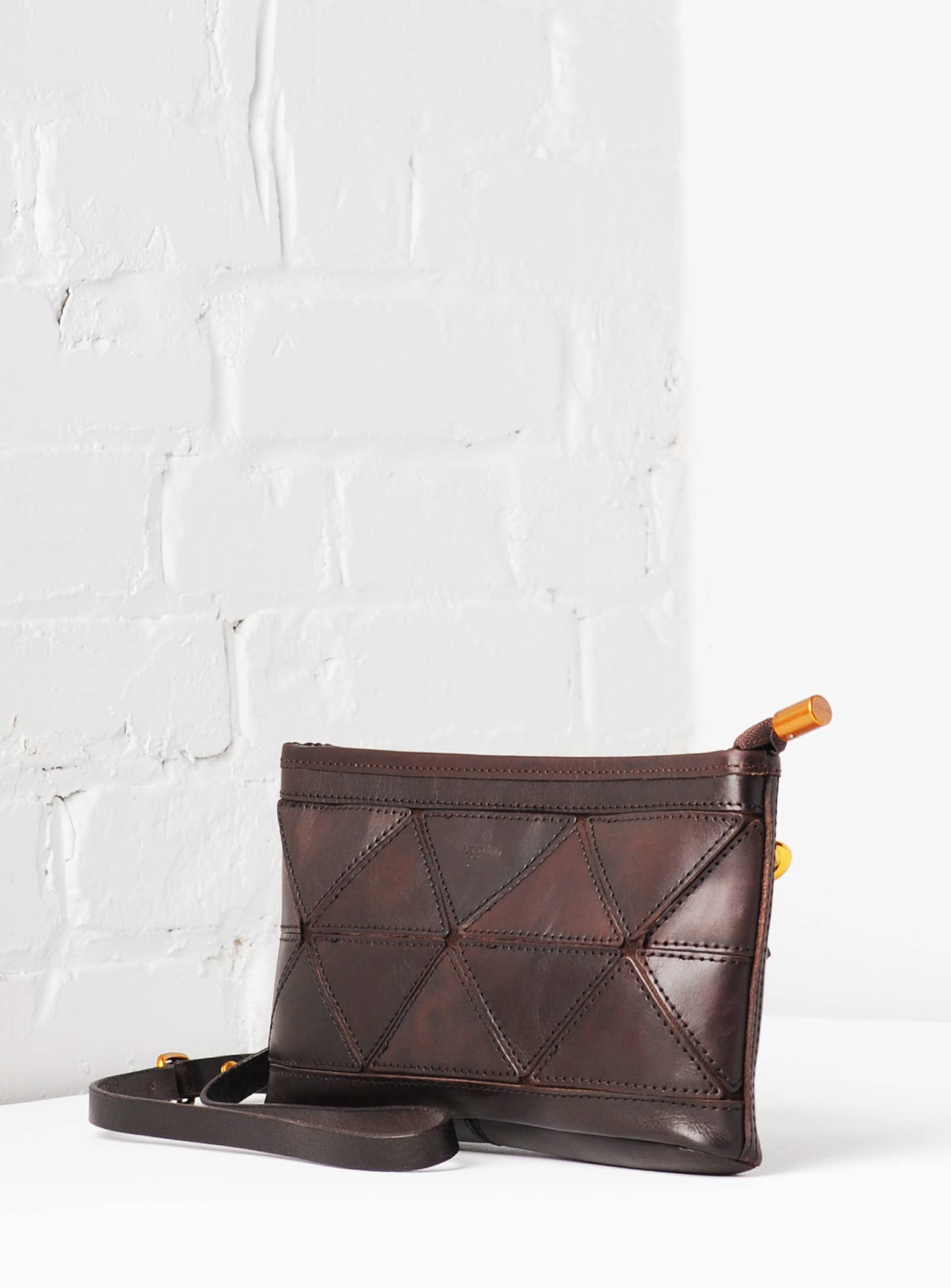 ‘Origami’ Clutches are made from repurposed leather scraps and puzzled together into a classic clutch design. The Origami Collection is a sustainable piece inspired by the Japanese art of paper folding. Comprised of precision-cut leather triangles assembled in a fascinating geometric pattern, each bag features distinctive variegated leather pieces with slightly different textures and colours. Japanese Vintage finished brass hardware adds luxury to the design. This design can be used as a hand-held oversized clutch bag or clip on the shoulder strap to use it as a sleek crossbody Bag!