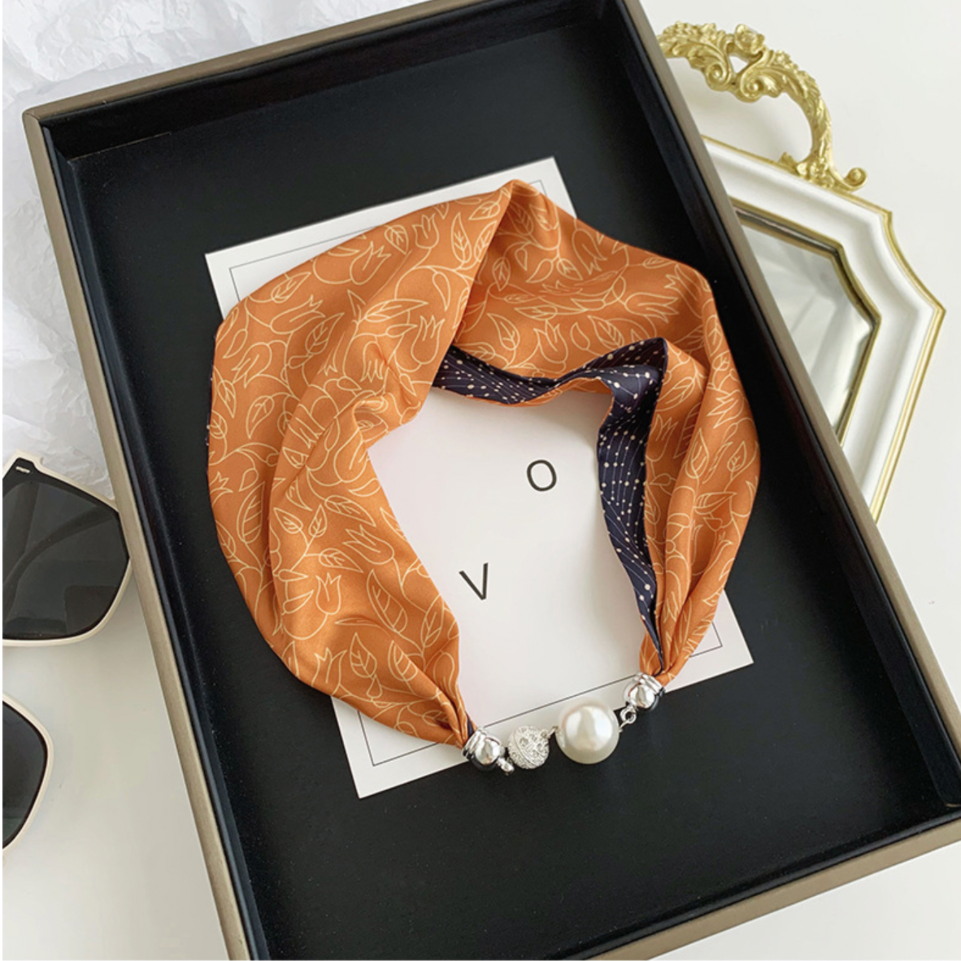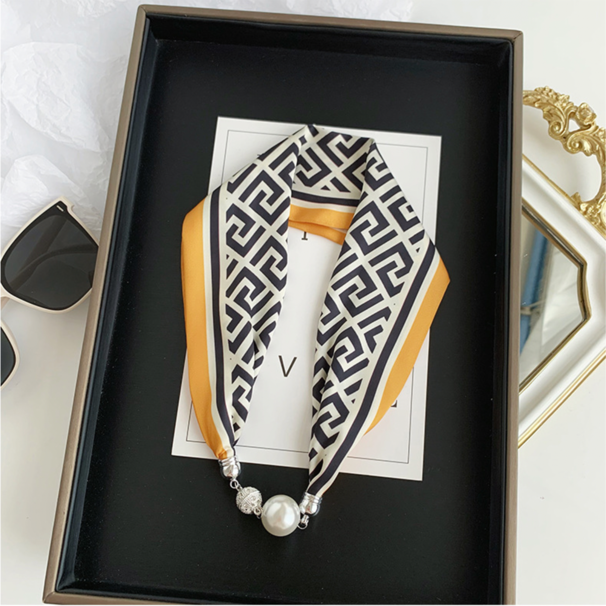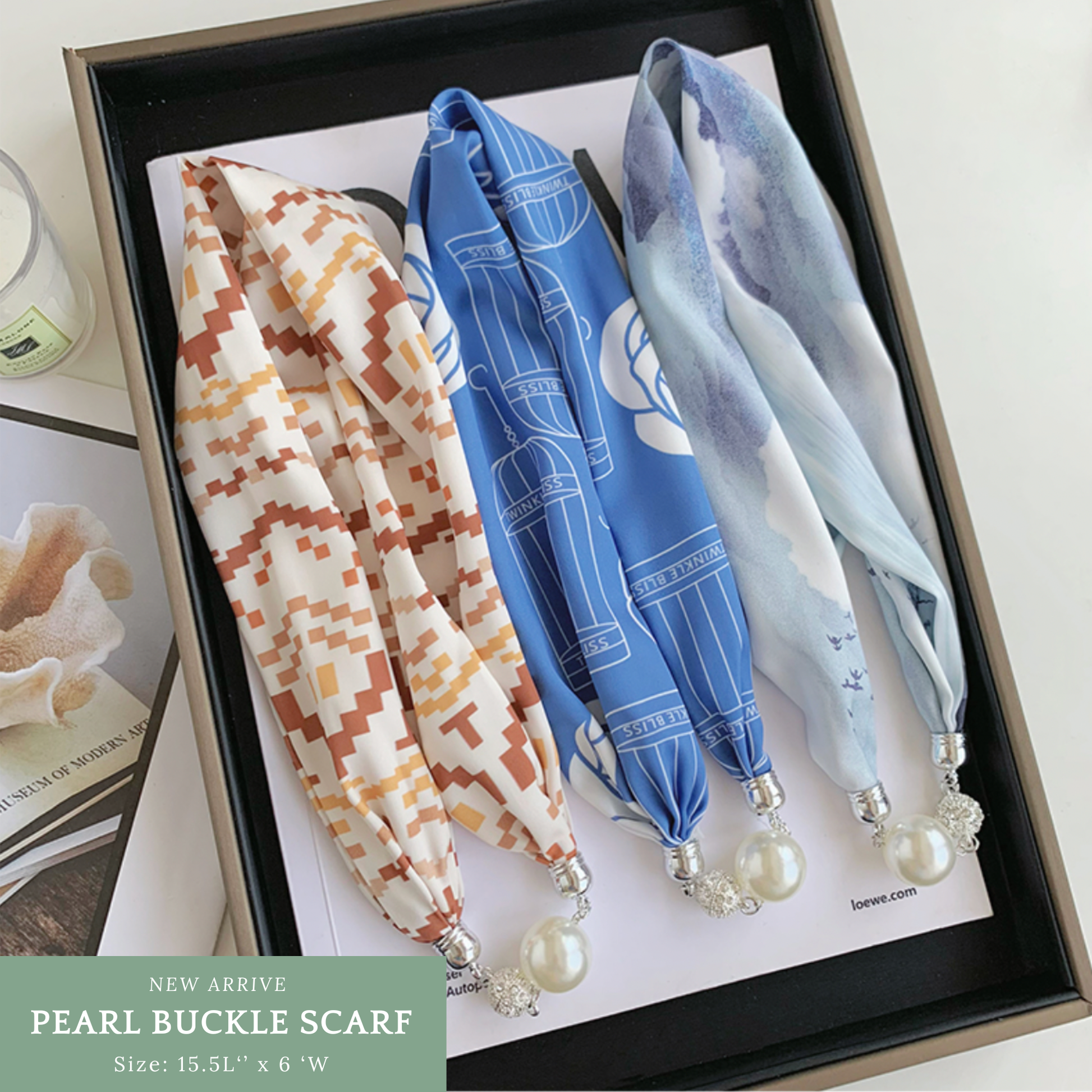 Sophisticated & Versatile: Each scarf flaunts a unique pattern, offering versatility to any outfit, be it casual or chic. The detachable pearl pendant allows for multiple styling options, making it an adaptable choice for fashion-savvy customers.