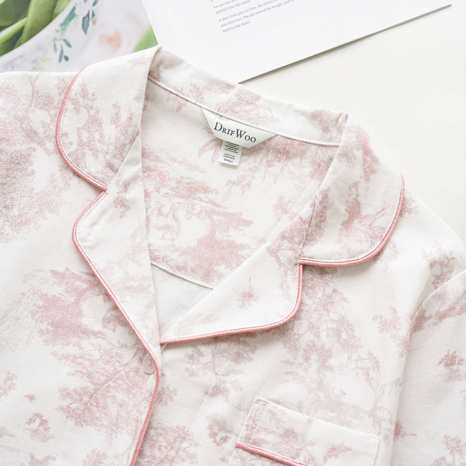 Soft pink toile pajama set made from breathable cotton—perfect for summer loungewear, spa gift boxes, and boutique sleepwear collections. Elegant button-down top with long pants in delicate toile print. Now available for preorder. Ships May 12. Sizes S–L.