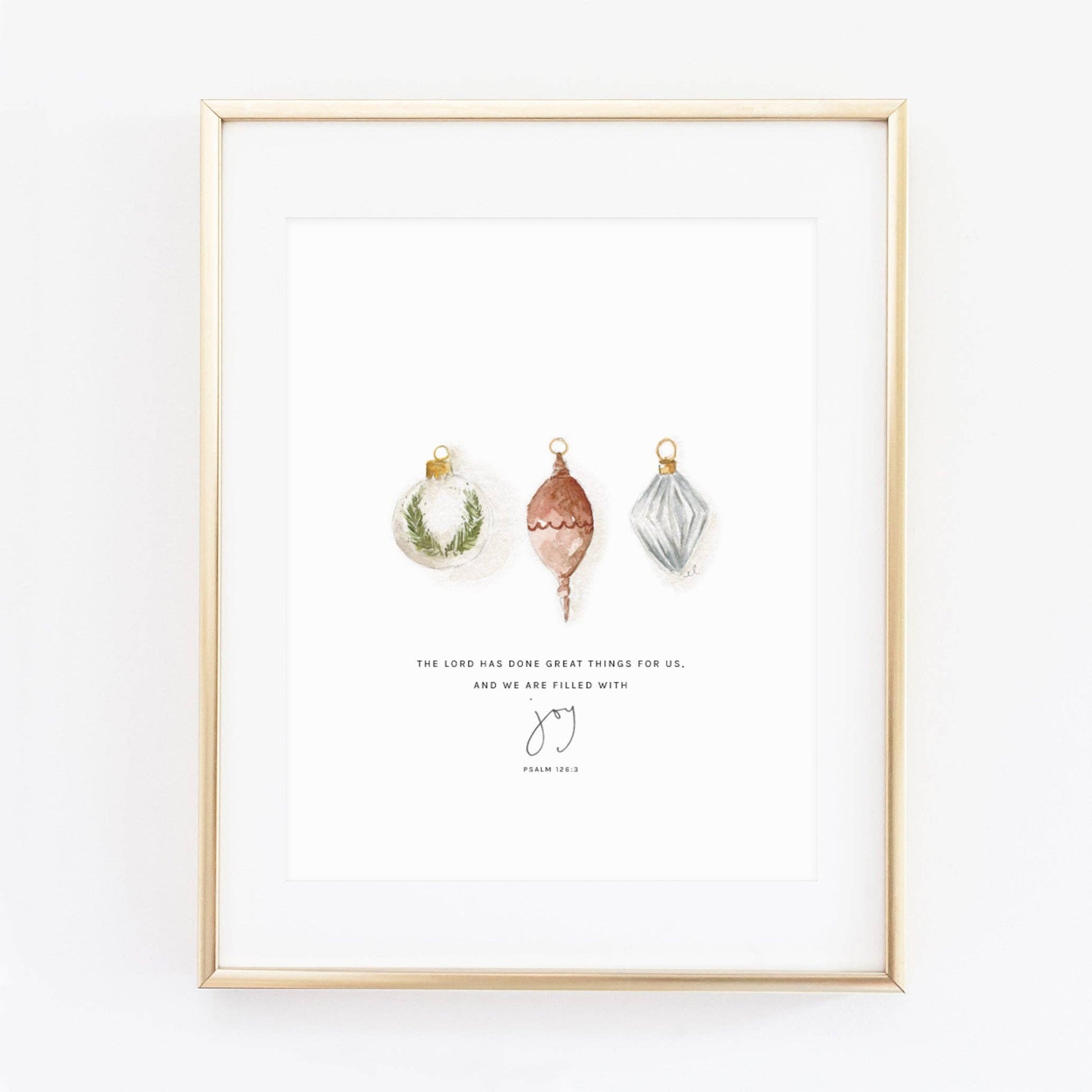 Ornaments watercolor illustration with Psalm 126:3: " The Lord has done great things for us, and we are filled with joy."