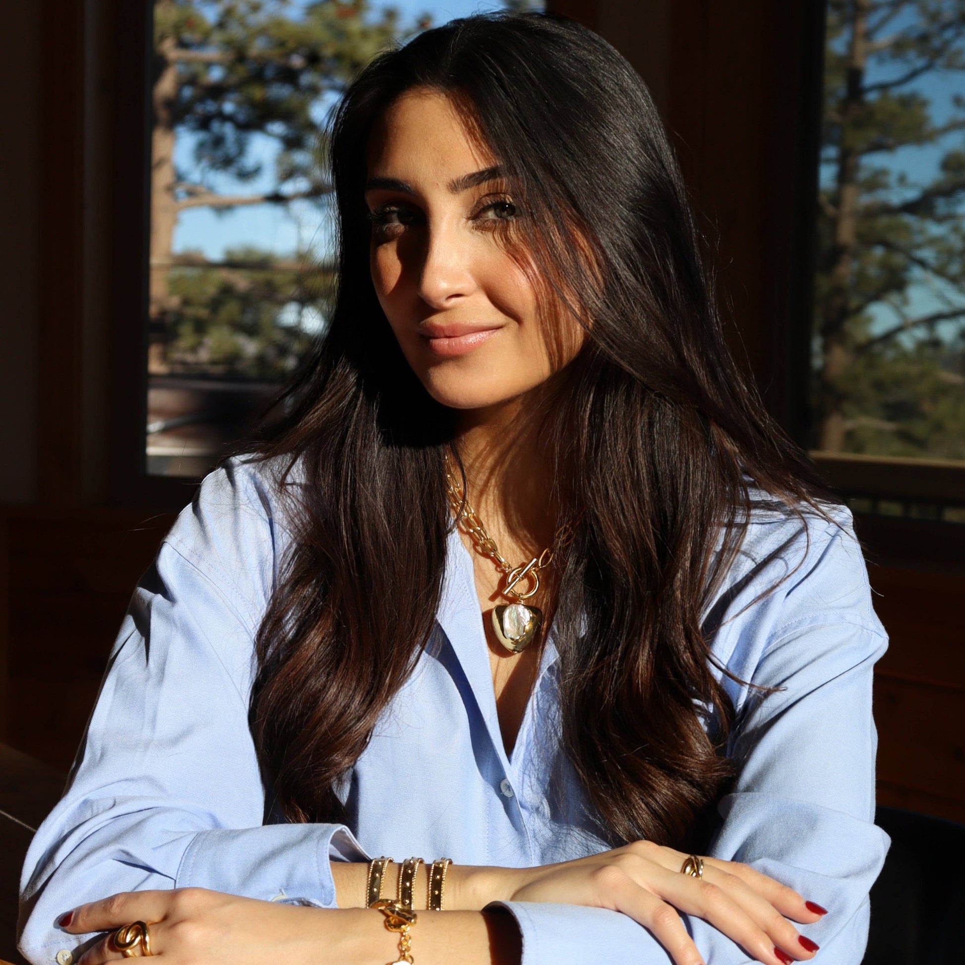 Gold statement necklace with a maxi heart charm inlaid with mother of pearl, paired with a trendy paperclip chain—elegant, bold, and timeless.