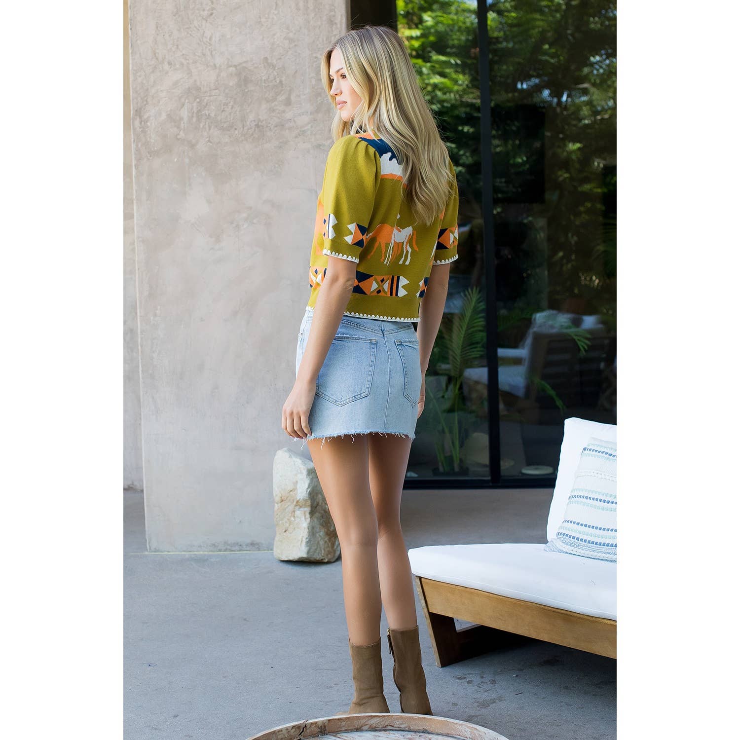 Short Sleeve Horse Detail Top . / Style Measurements for Size S / Designed in USA - Body Length: 21 in - Bust Width: 37 in - Sleeve Length: 12 in . Fabric Content - KNIT / 55% Viscose, 28% Polyester, 17% Nylon