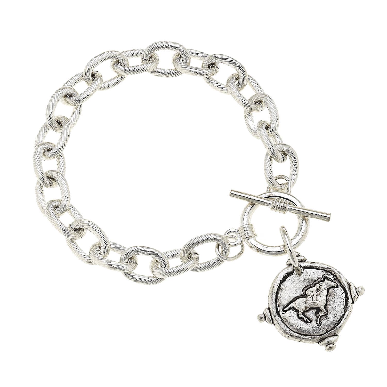 Discover the charm of the Susan Shaw Silver Race Horse Bracelet. This distinctive piece is an embodiment of Susan Shaw's three-decade-long commitment to unique and elegant design. Handmade by experienced artisans in our San Antonio boutique workshop, this bracelet captures the spirit of Northern European styling, and the beauty of American-made materials. Whether you're accessorizing for a special occasion or adding a touch of elegance to your everyday attire, this race horse charm bracelet is a stunning choice that meets the highest standards of quality. Wear a piece of art that is as unique as you are with Susan Shaw.