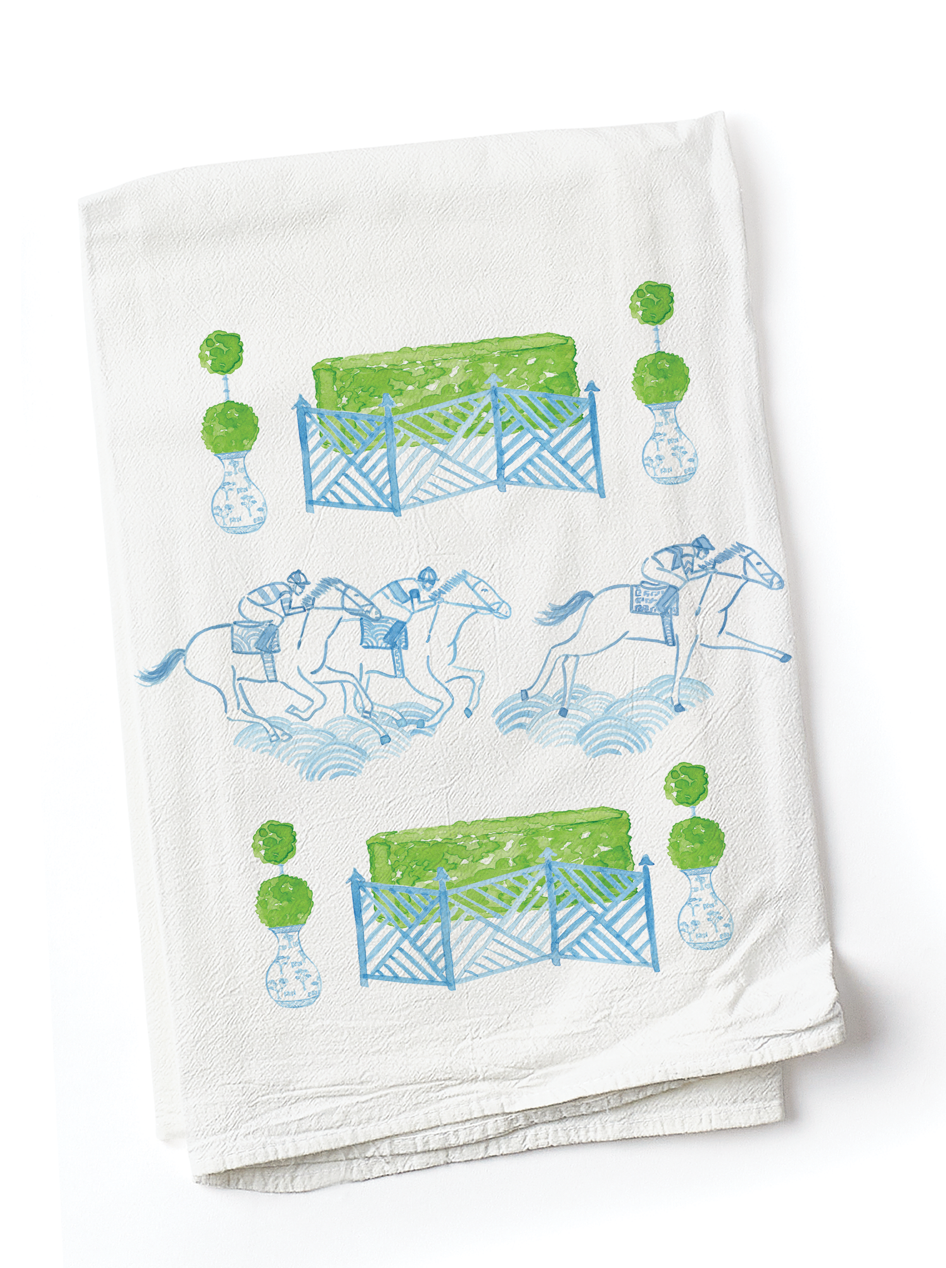 Elevate your kitchen with this stunning 30" square tea towel, featuring a vibrant watercolor illustration of a charming Steeplechase. Crafted from 100% soft, absorbent cotton, this towel is both practical and beautiful. Perfect for drying dishes, wiping surfaces, or adding a touch of artistic flair to your kitchen or powder room decor.