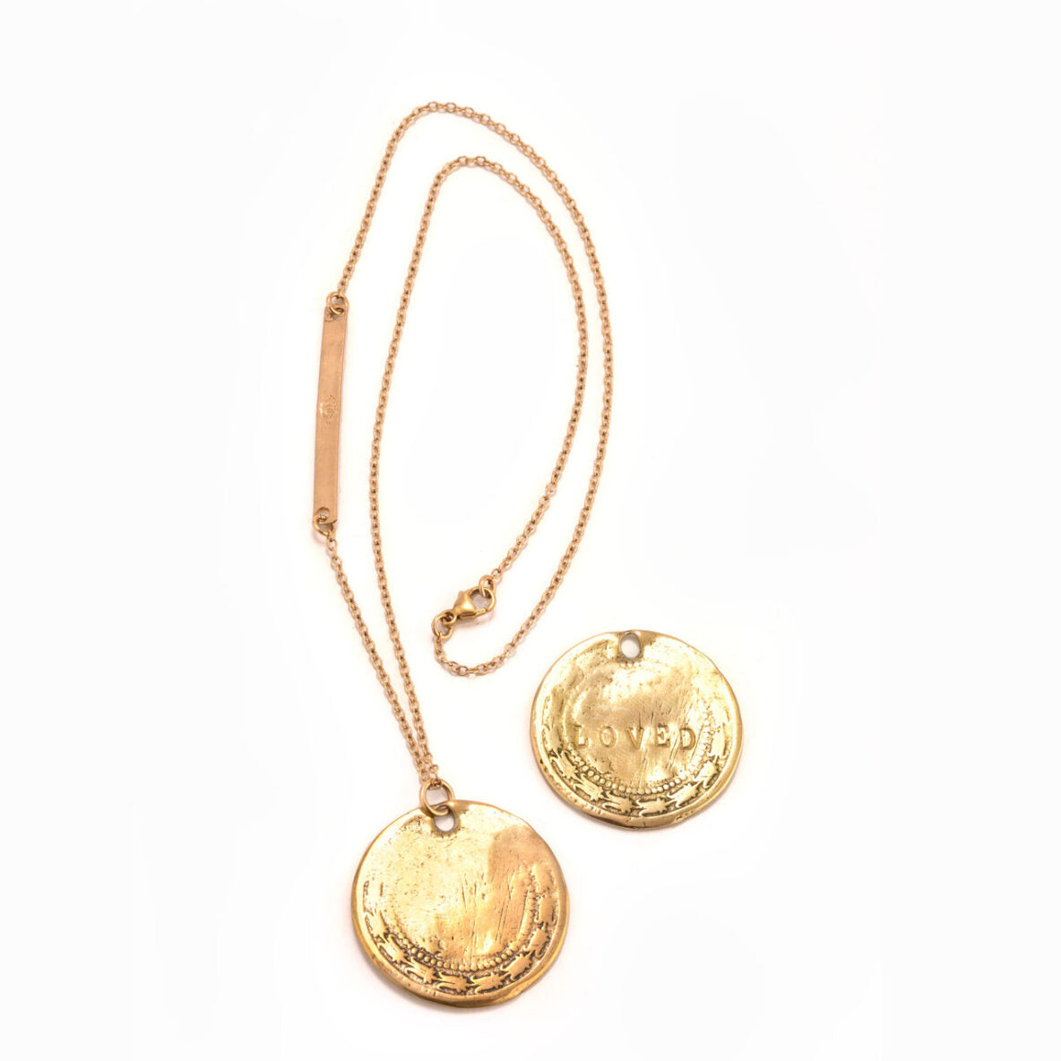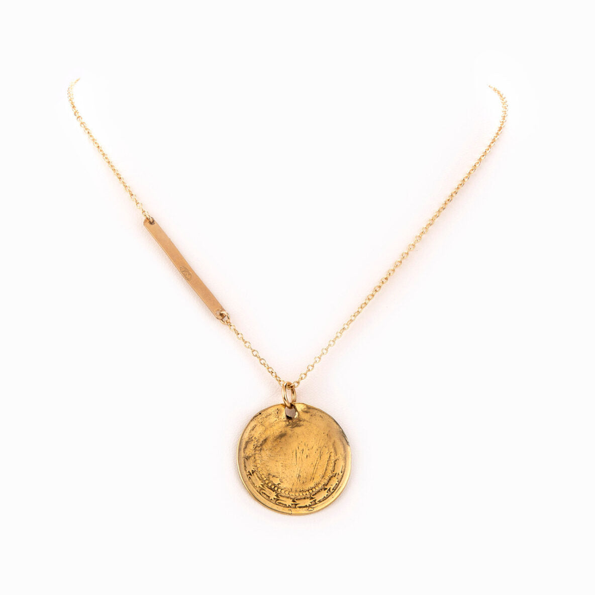 14K gold filled chain with gold side bar and antique gold coin. 18 inches long.