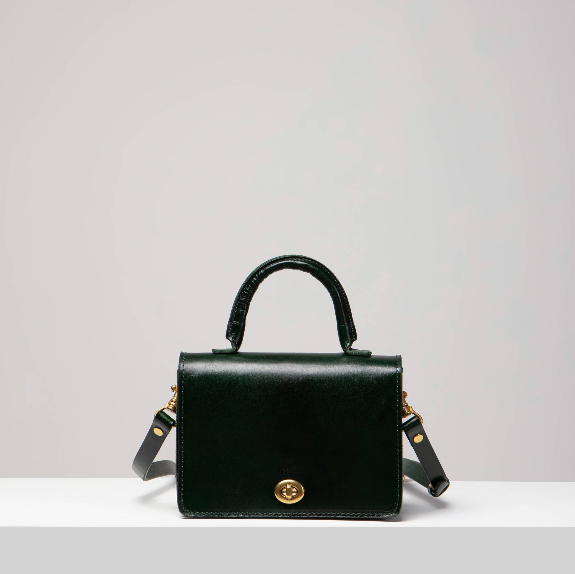 The 'Turn-loc' Mini Satchel features an elegant structured form with a posh leather selection. handcrafted from genuine Italian full-grain leather, offering both durability and a luxurious feel. Its timeless, classic design is enhanced by a striking turn-lock brass closure. The rich texture of the leather ages beautifully. The sleek silhouette makes for the perfect evening bag.
