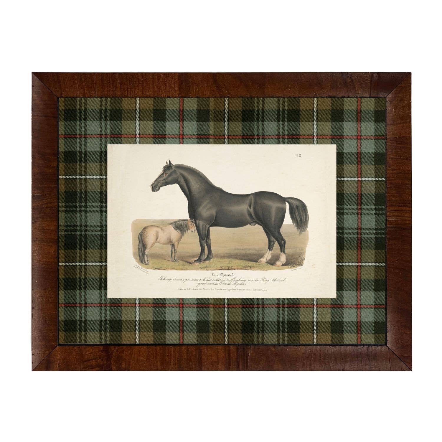 Vintage horse bookplate F matted in green and brown tartan under glass in a wooden frame