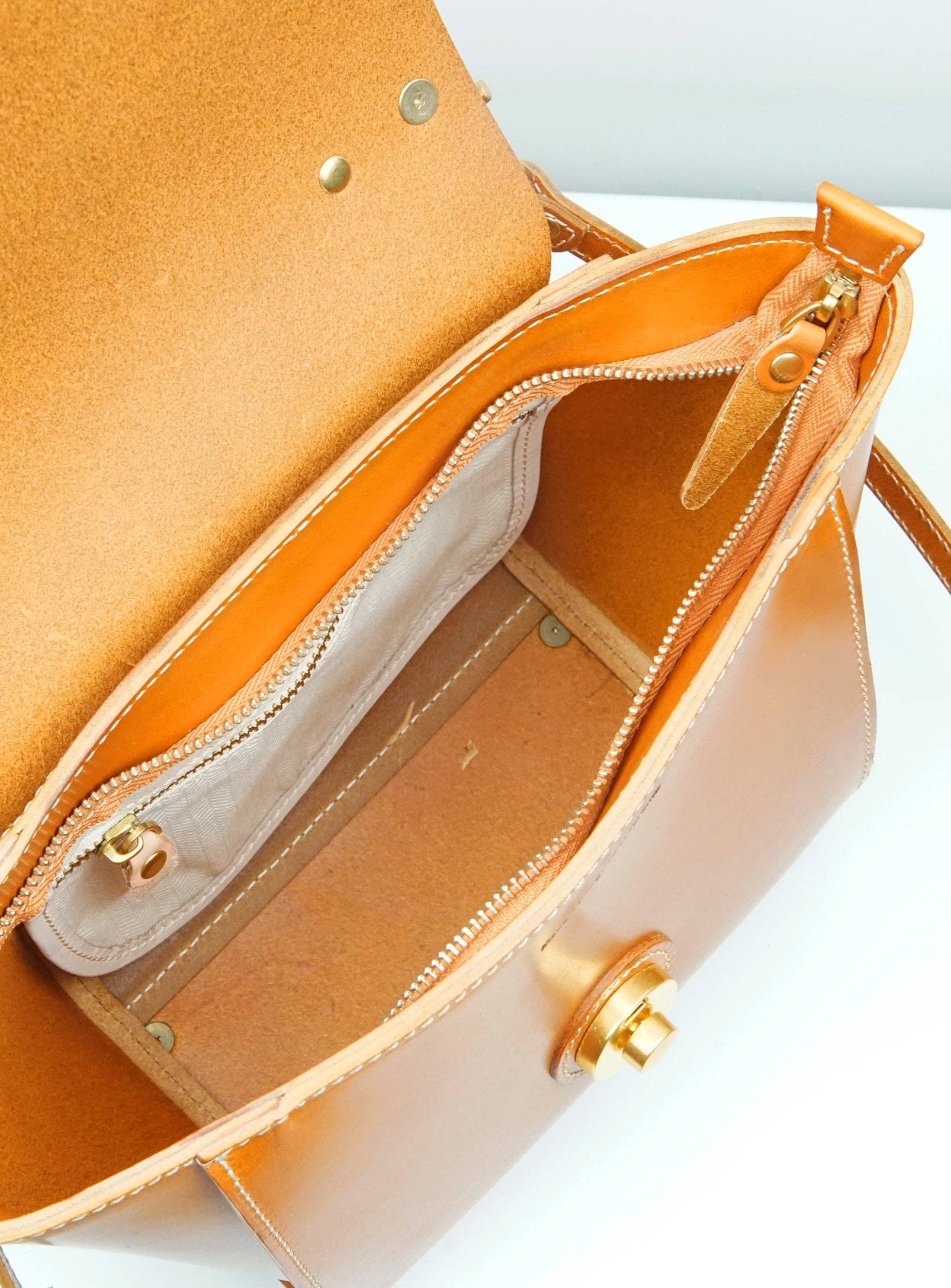 The Classic Vive Top-Handle Satchel with a new and improved design! This elegant structured leather satchel is perfect for your office attire or dress it up for an evening out. With exceptional high quality materials like Italian vegetable tanned natural leather and Japanese brass hardware, this is a handbag you will hold onto for life. The front statement Japanese brass turn lock is stylish while securing your belongings in a safe place. The deep leather colour will become richer and more supple with age. Exterior slip-in pocket and interior leather trimmed zip pocket for easy access to all your essentials.
