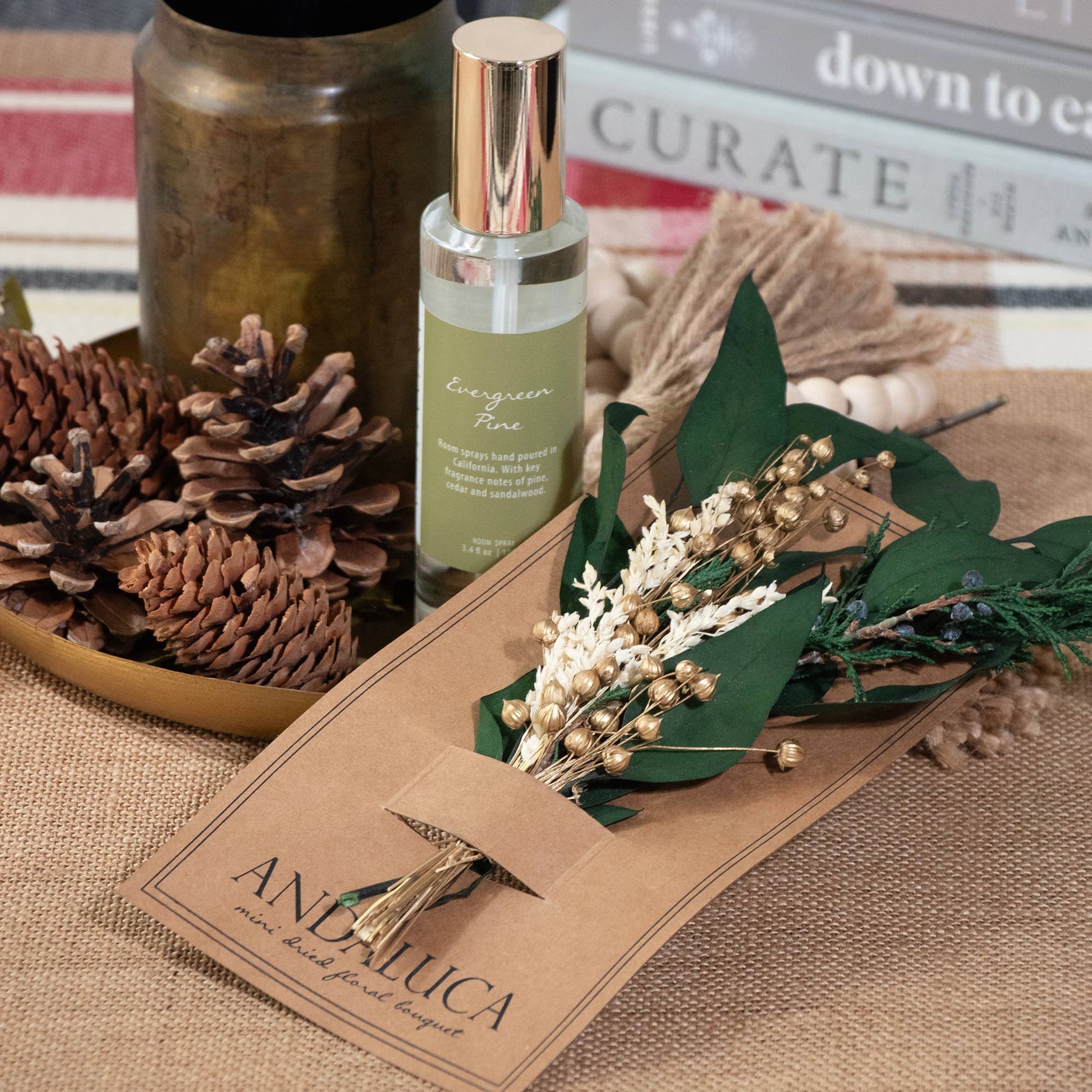 Our floral team designed this beautiful MINI bouquet using an assortment of willow eucalyptus, juniper sprig, grains, and flax to create this charming and petit mini bouquet arrangement. Each bouquet is designed and handcrafted in our California design studio and is a perfect decorative accent to your tablescape or vignette.