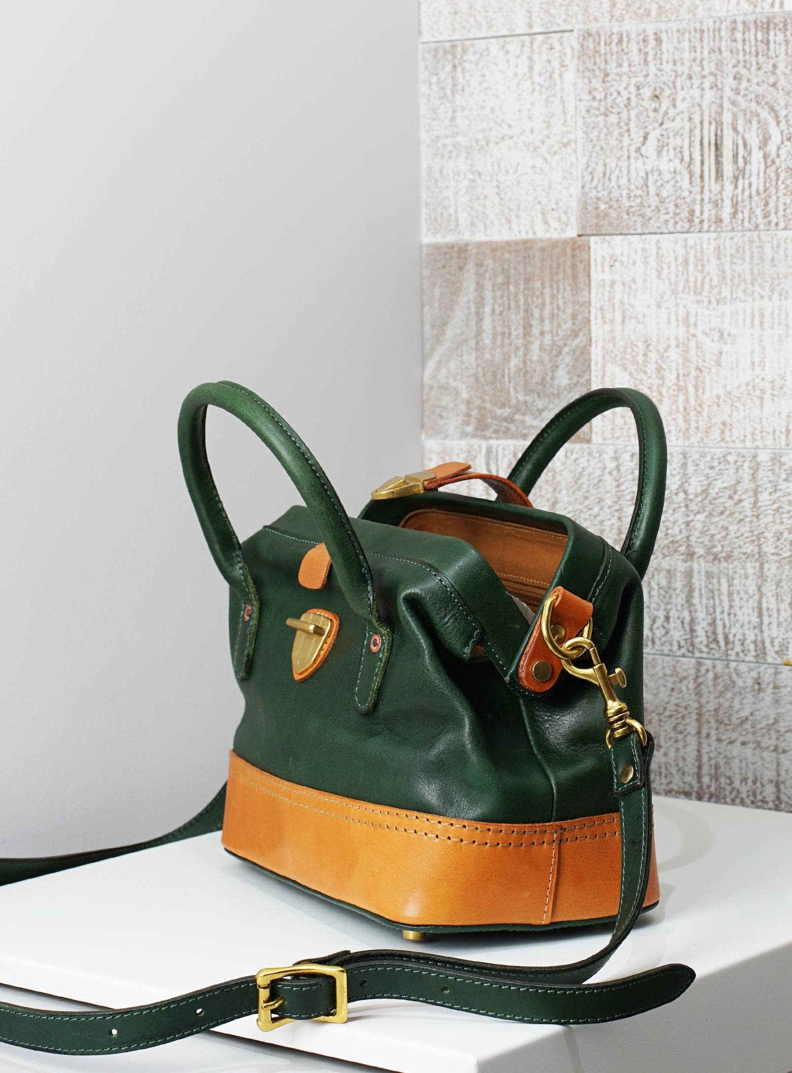 XL Vintage satchel is Inspired by the original design, the ‘Wonder Bag’, this Top-Handle Satchel still has the doctor bag structure and form but with a vintage twist. The whole bag features a vintage patina finish with durable luggage leather trim on the bottom, lock flap and strap tabs. The handles have a comfortable rolled grip and the bag is framed with Uppdoo’s signature hinge to keep the bag open when you need it!